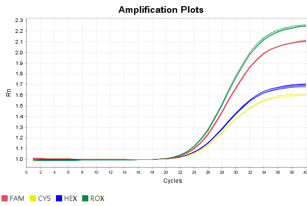 利用探針法擴(kuò)增從2.5ng/μl的質(zhì)粒DNA模板至5倍梯度稀釋0.12fg/μl, 圖中顯示的是每個(gè)稀釋梯度重復(fù)4次的結(jié)果,顯示Qgen960 Plus具有寬廣的動(dòng)力學(xué)范圍。